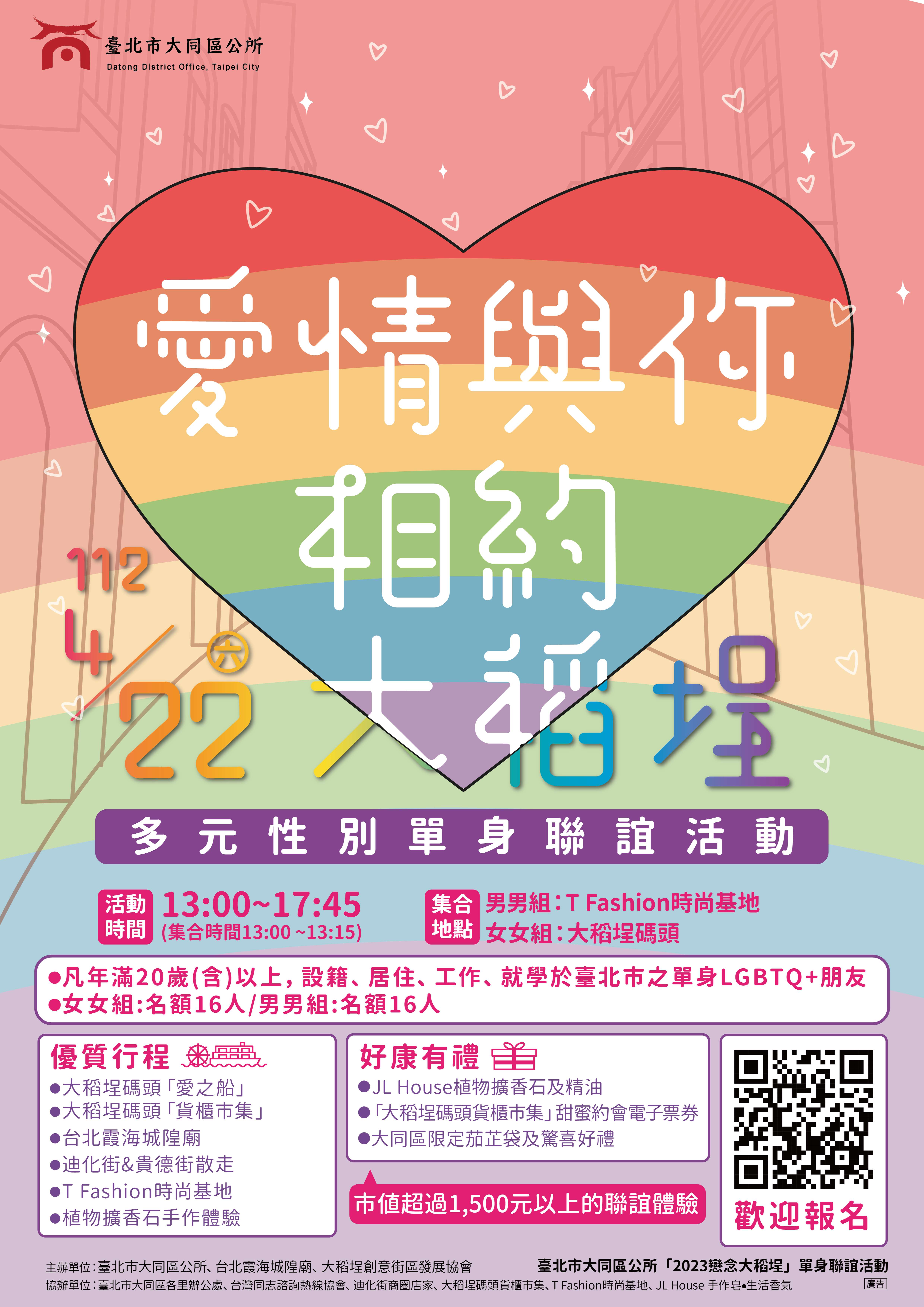 二、凡年滿20歲(含)以上,設籍、居住、工作或就學於臺北市之單身同志朋友皆可參加,總計32個名額,男男組、女女組各16名,免參加費用、免保證金,詳情請見活動海報或線上報名網址(https://forms.gle/QoopCBbGG994EFRm7)或電洽(02)25975323轉806大同區公所古小姐。」