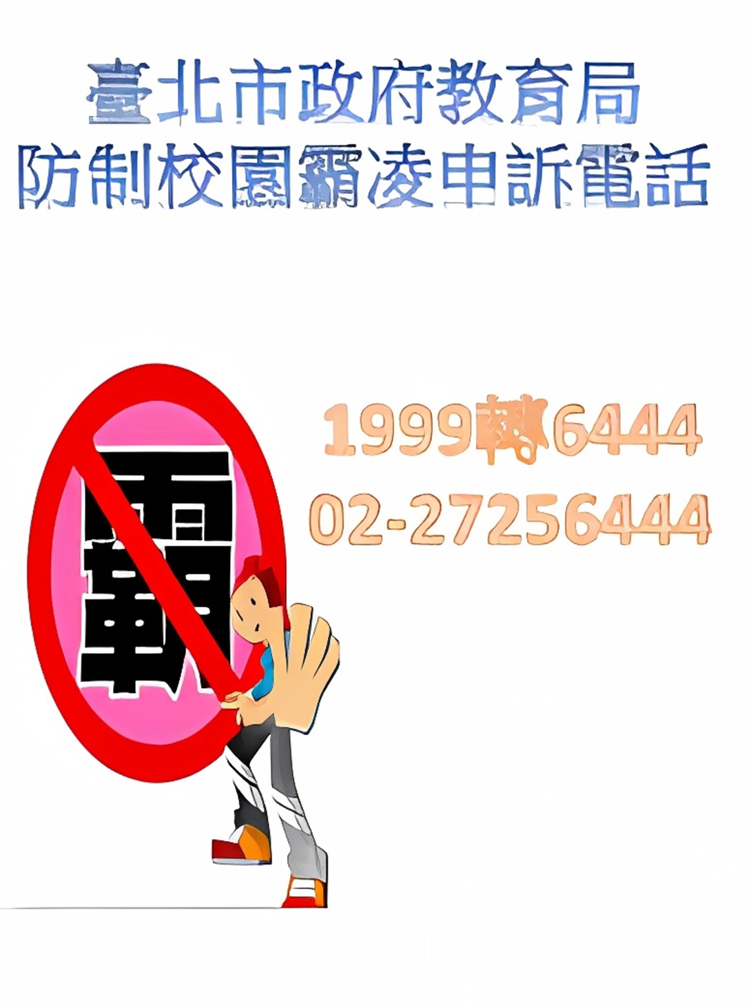 臺北市政府教育局防制校園霸凌申訴電話:1999轉6444