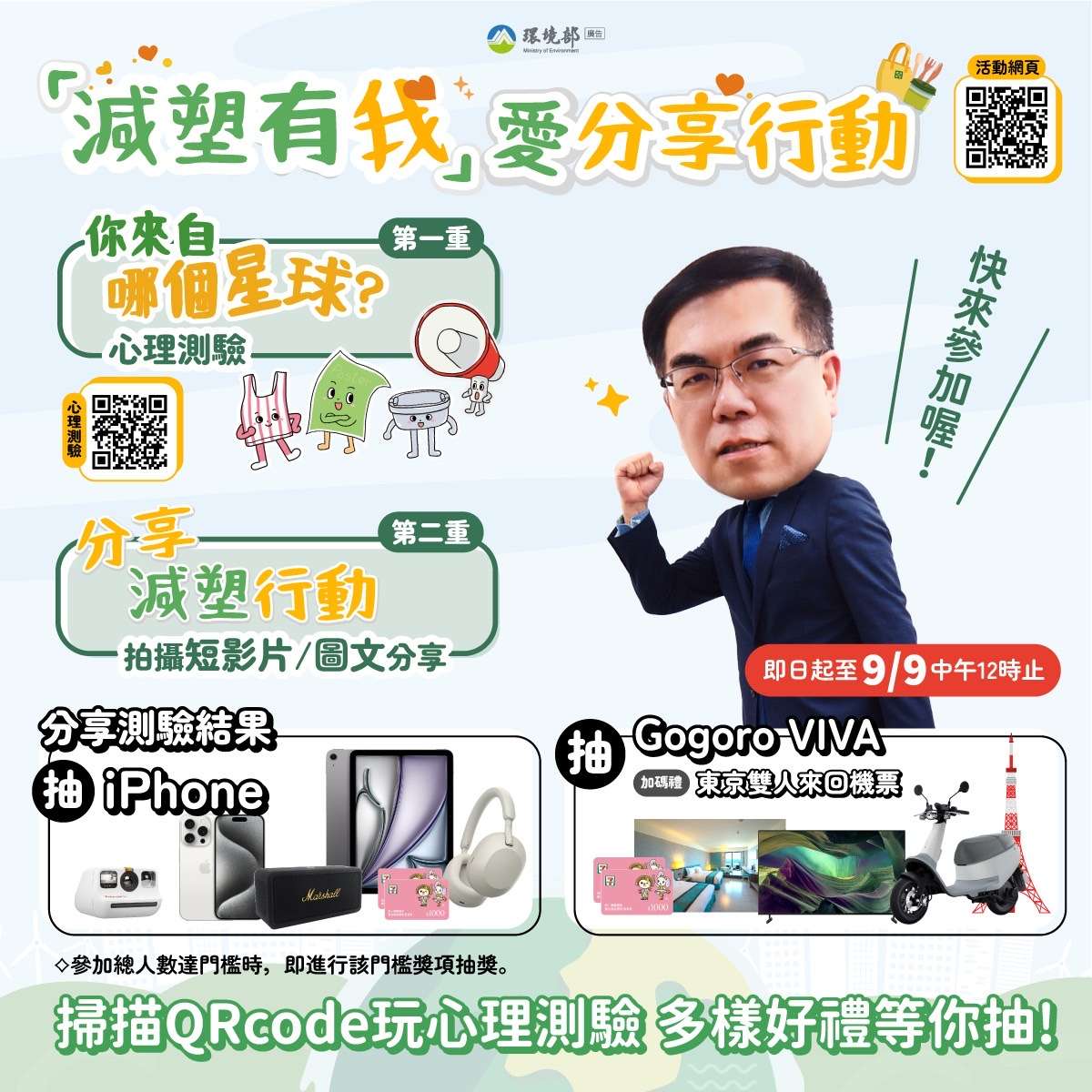 環境部為鼓勵社會大眾及莘莘學子一起跟上全球減少塑膠 的風潮,特辦理「減塑有我」愛分享行動,可透過臉書 (Facebook)、Instagram(IG)等社群媒體,拍攝個人生 活中減塑短影片、減塑生活照片,並可透過參加「你來自 哪個星球?」心理測驗遊戲,瞭解並發覺屬於自己獨特的 環保行動,歡迎民眾邀請親朋好友一起在生活中響應減塑 行 動,參加旨揭活動拿大獎。