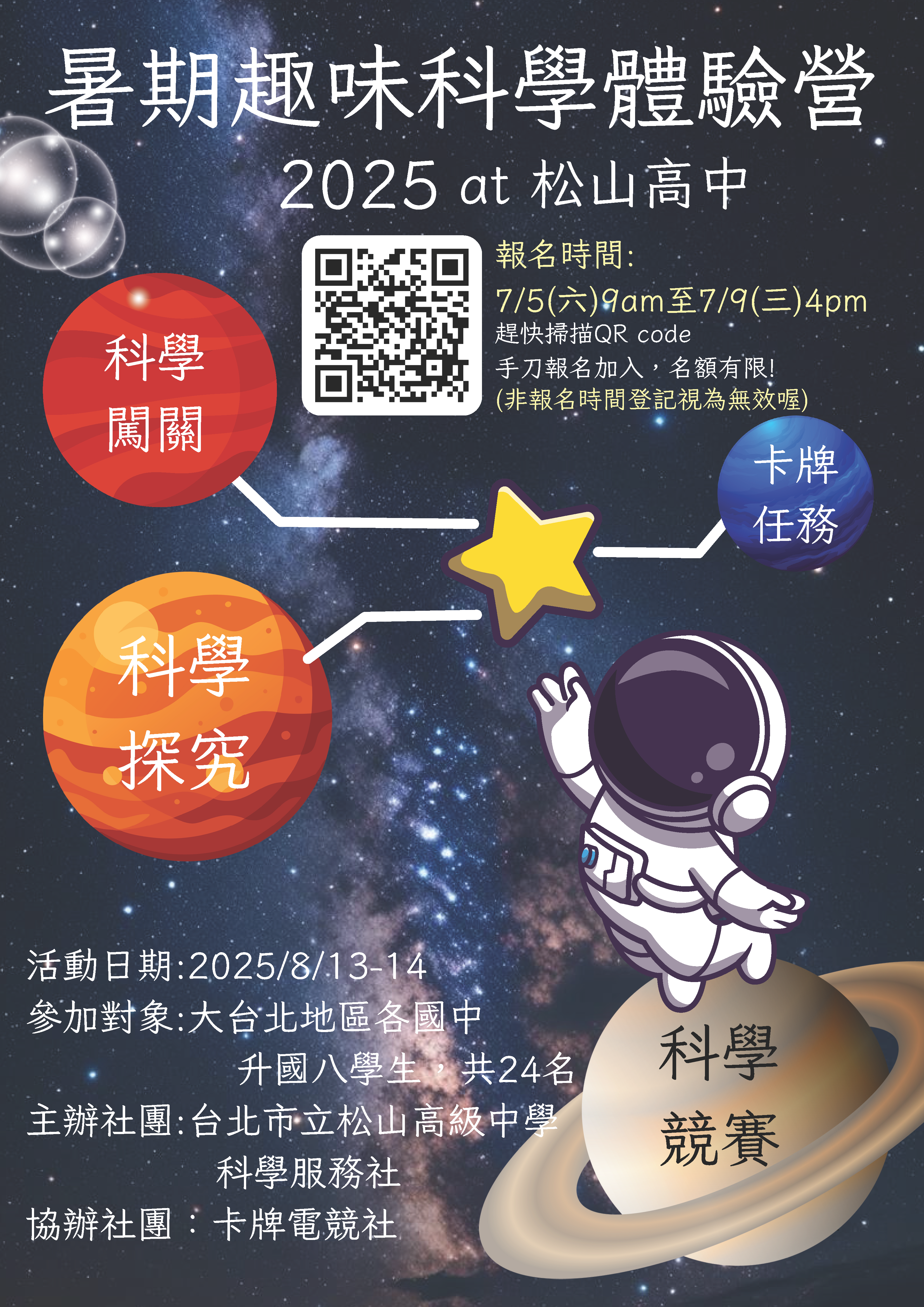 說明:由臺北市立松山高級中學科學服務社籌備策畫 「114年度暑期科學趣味課程體驗營隊」活動。
